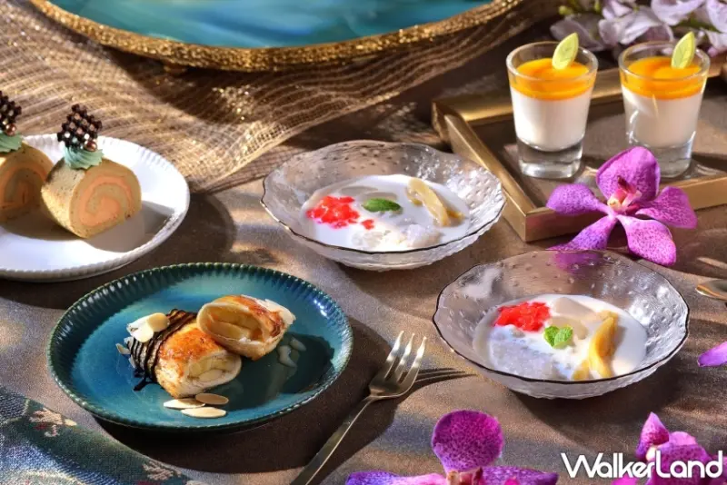 最後,就是甜食控最愛的「甜點區」,絕對不能錯過繽紛多彩的代表性泰式甜品「摩摩喳喳」,香醇芋頭椰奶搭配西米露、白色亞達子、金黃色的菠蘿蜜及亮紅色的荸薺等豐富配料。曼谷街頭隨處可見的「香蕉煎餅」,特以烤過的吐司替代油煎餅皮,輕柔裹入香蕉,感受外酥內柔的層次口感。「黑糖泰式奶茶捲」黑糖蛋糕體蘊藏濃醇泰奶內餡,上頭輕擠上斑蘭葉風味奶油,甜而不膩。入口香濃綿密的「芒果椰香奶酪」,引領味蕾猶如置身於南洋小島。