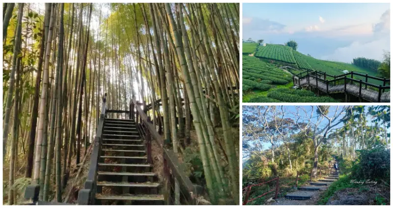 位在阿里山風景區附近的「石棹步道群」,總共有6條步道組成,不僅有整面山坡的茶園風光,也是飽覽日出、晚霞、雲海的絕佳景觀點,而步道之一的「霞之道」木棧步道兩旁還有茂密的竹林林立,療癒景色一次打卡;多為階梯的「阿拔泉山稜線步道」,也有多處可以停下來觀賞遠方山嵐景色,運氣好的話,還能看到壯觀的雲海風景。![]()