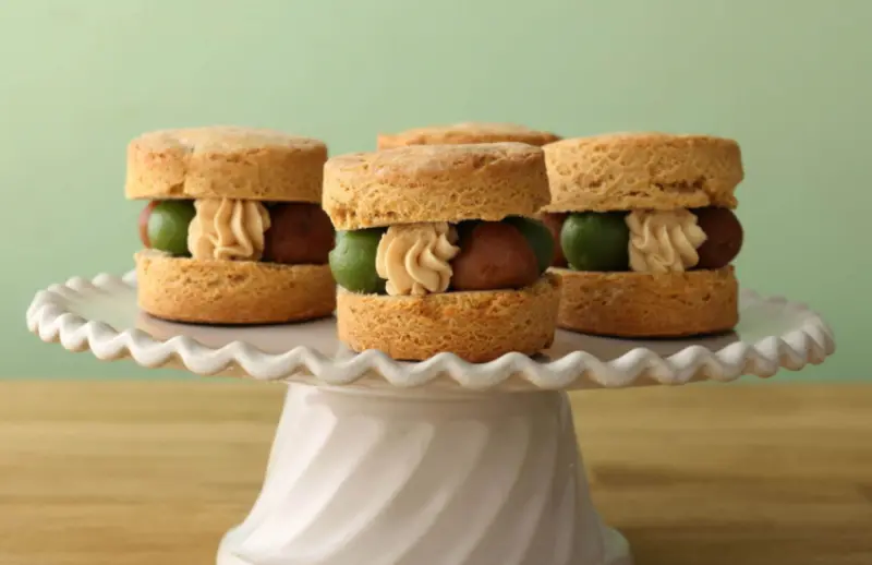 東京丸之内的「東京禮物調色盤」裡有一家司康專賣店「BAKERS gonna BAKE」,推出了「黃豆粉夾心司康 宇治抹茶糰子&黃豆粉餡(きなこスコーンサンド 宇治抹茶だんご&きなこ餡)」,將香濃黃豆粉與豆漿混合,製成司康,中間夾入有嚼勁的宇治抹茶糰子與黃豆粉餡、特製焦糖奶油,打造出和洋融合的甜點。