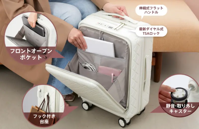 這款行李箱可以透過拉鍊,拉開前面的收納空間,前面的收納空間再拉以後,即可直接打開主收納空間!在狹小空間內,也能方便地打包。前開部分的內部可放入13英寸的電腦,網狀口袋可收納小物和文件,方便整理和收納。在側面還有掛勾,可以掛在機場購買的伴手禮。![]()