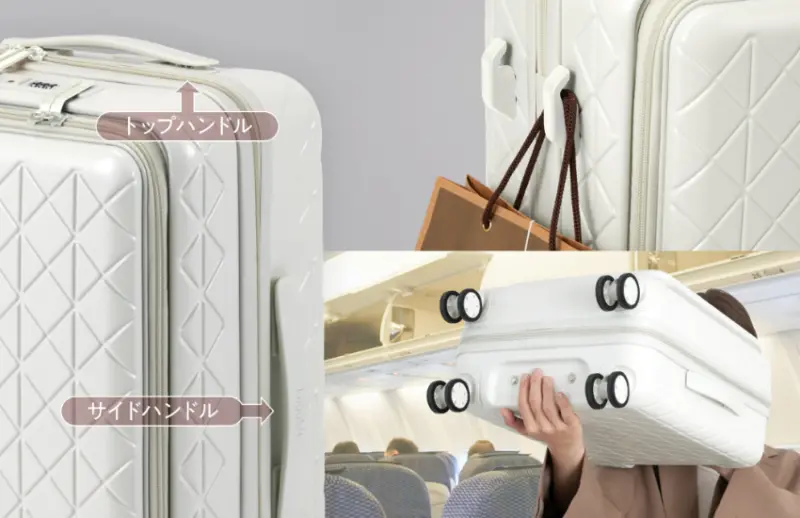 這款行李箱採用了優質的ABS樹脂作為主要材料,表面塗裝PC(聚碳酸酯)薄膜,打造出輕量且堅固的外殼。同時,凹槽設計也使外殼不易被刮傷。底部設有方便舉起和放下的手把,帶有掛鉤的底座可懸掛袋子或折疊傘等物品。![]()