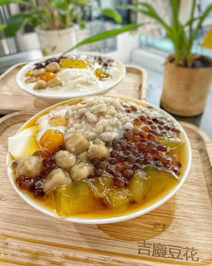 吉慶冰沙豆花的招牌豆花、剉冰主打使用手炒糖水冰沙,打造出不死甜的清爽口感,還有古早味麵茶、Q彈粉粿等特色品項,與手炒冰沙尬著吃超對味,此外,濃郁豆漿冰沙豆花也是很多熟客推崇的熱門必吃款,再加入2~3種配料,滿滿一碗豆花50元開吃。
