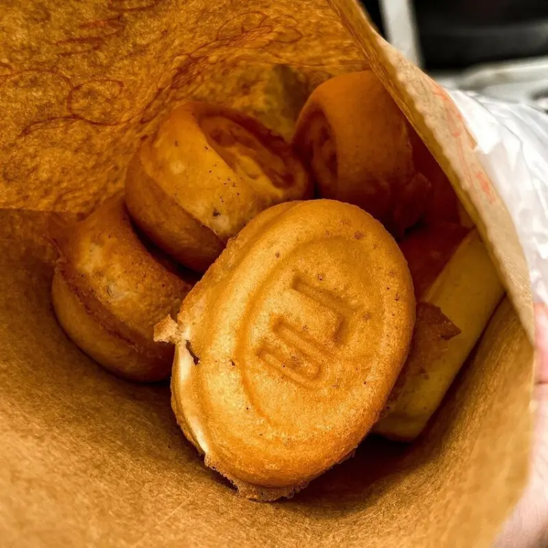 虎尾在地人氣小吃攤「碳烤鴨蛋糕」,不僅將原料雞蛋改成鴨蛋,還使用碳烤方式製作,比起一般的雞蛋糕,外皮更酥脆、內餡也更Q彈,帶有微微的炭香味與鴨蛋香味,3個只要10元就能吃到,獨特銅板價小吃成功收獲在地人的喜愛,路過就能看到店家前長長的排隊人潮。