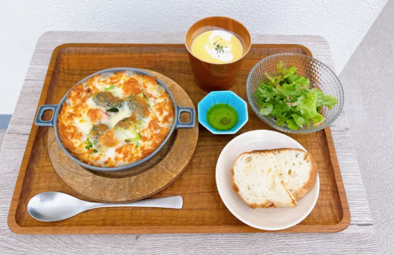 可以一次攝取半天份量的蔬菜焗烤料理,還包含珍稀魚類「五月鱒」。取自水深200米以下的海洋深層水,由於未受到太陽光照射,能保持低溫穩定,非常適合養殖珍稀魚類五月鱒,特別在高知縣室戶市進行陸上養殖。不僅能一次補充豐富的蔬菜,也能品嘗到五月鱒魚的鮮美。※麵包可以替換成米飯。價格1,800日幣。![]()