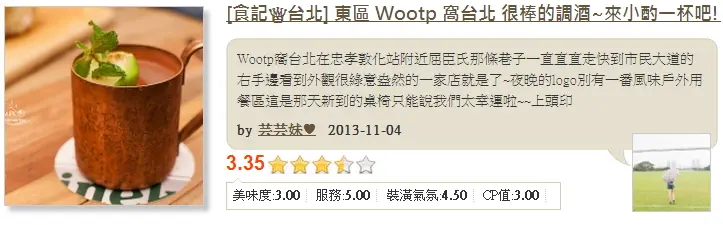 Wootp 窩台北在忠孝敦化站附近,屈臣氏那條巷子,一直直直走快到市民大道的右手邊,看到外觀很綠意盎然的一家店就是了~ 老闆除了調酒厲害外,他的第二興趣就是喜歡蒐集古董,店裡頭有許許多多古董玩意兒,燈飾、椅子、桌子還有一些擺設的物品,都是老闆用心挑選,積年累月蒐集而來。
