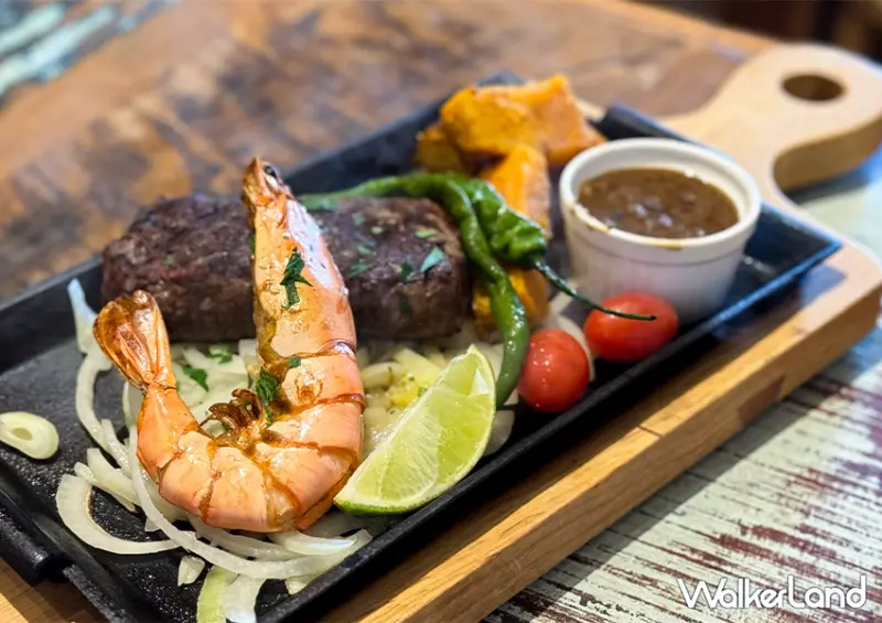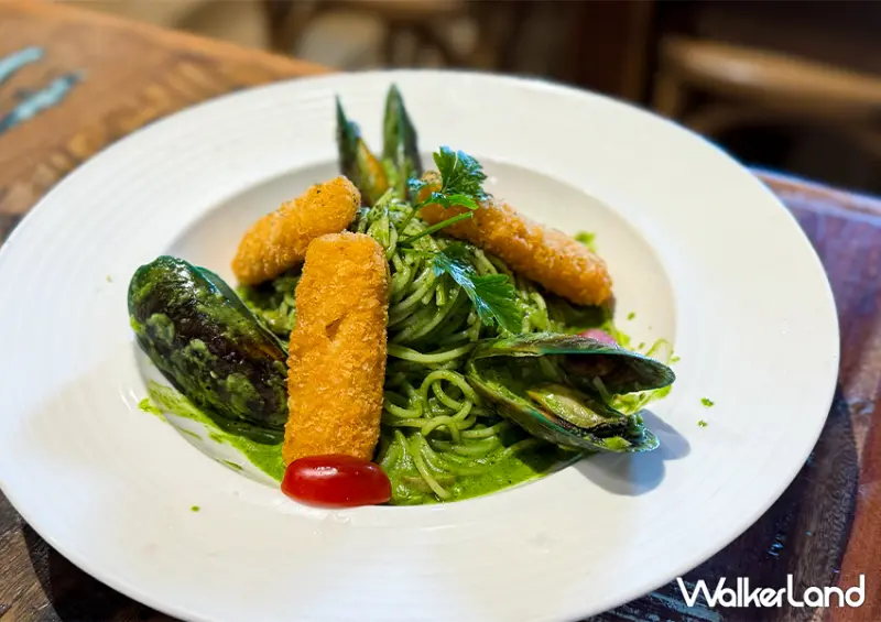 餐點部分主打美式口味,包含義大利麵、牛排排餐、炸物沙拉等,選擇相當多樣化,這次選擇了「酥炸魚柳青醬義大利麵」、「莊園海陸雙拼」兩份主餐。