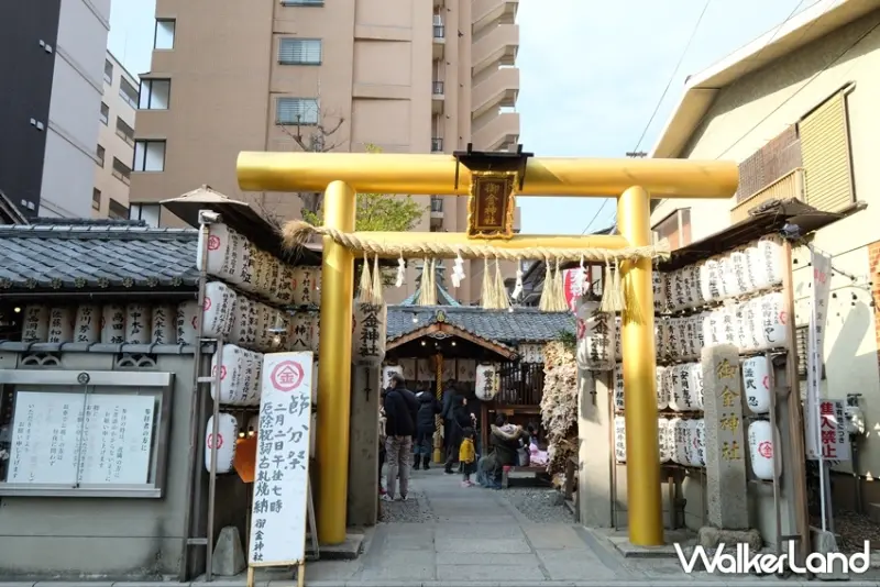 「御金神社」藏在京都住宅區巷弄之內,從地鐵「二條城前站」或「烏丸御池站」步行大約五至七分鐘。金色大鳥居相當醒目,據聞鳥居最初為木造,因颱風受損後才變成鐵製鳥居,而在2006年有間金箔店大量捐贈金箔,讓「御金神社」的鳥居就煥然一「金」。