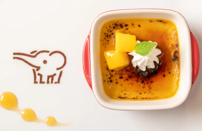 夏姫會席套餐價格4,980日圓,含稅,如果再加上飲品無限暢飲,總計是6,000日圓。夏姬會錫套餐最特別的就是甜點,盤子是象印的LOGO喔。這份套餐必須提前一天預訂,不接受現場點餐。前菜共有9種,包含:白木耳與早摘榨菜佐梅芥末配鯛魚皮、白和風味嫩玉米、鮭魚卵壽司、綠豆豆乳凍、鮭魚生魚片配香醋醬油、辣味味噌蒸雞與川七菜、彩色蔬菜涼拌豆腐、炙燒明太子、茄子與脆米生薑餡和生魚片。其他小菜包含鰻魚涼拌黃瓜、鱧魚漿生薑紫菜炸物、和牛沙朗烤牛肉配山葵醬油。飯的部分是一碗炎舞炊煮米飯,附一碗手毬麩與湯葉清湯。甜點則是米粉芒果焦糖布丁。![]()