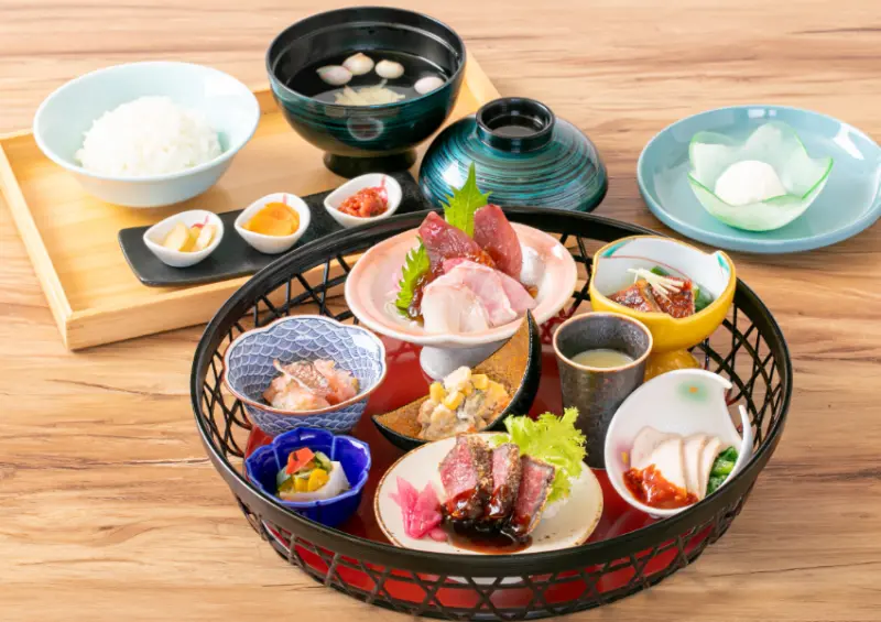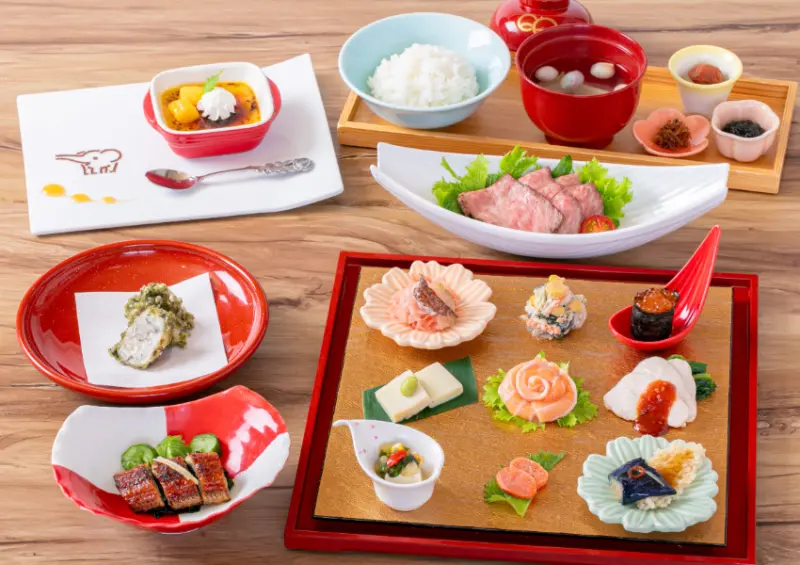 象印御膳,附鯛魚茶泡飯,整套只要1,980日圓,含稅。主菜可從魚、肉、時令主食中選擇。套餐內容包含:薄切真鯛魚、鯛魚高湯。3種單盤小菜包含:白木耳與早摘涼拌榨菜佐梅芥末,配鯛魚皮、毛豆豆乳寒天、彩色蔬菜涼拌豆腐。一口小菜包含:炙烤明太子、芥末風味海苔佃煮與醃黃瓜、橄欖油漬梅干。2碗炎舞炊煮米飯、秋葵與海帶味噌湯。甜點則是米製冰淇淋。![]()