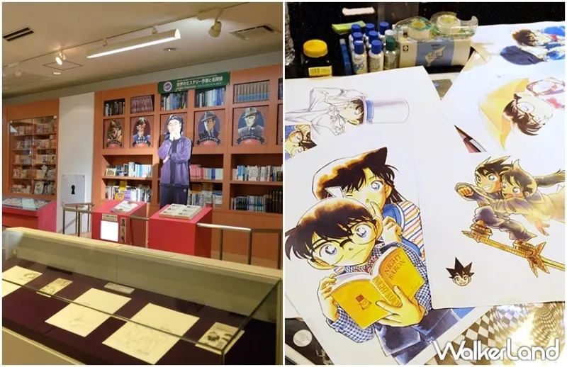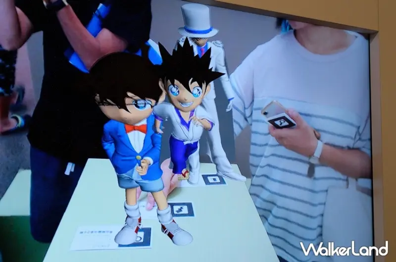 館內除了有大螢幕播放動畫片段之外,最酷的是「青山剛昌故鄉館」還將《名偵探柯南》的經典款道具設計成互動遊戲,像是蝴蝶結變聲器以及滑板,讓影迷可以體驗成為柯南的感覺。此外,也有結合了近年流行AR技術的互動裝置,只要將門票置於特地為置即可和柯南和怪盜基德等人合照,其中有名男孩是青山剛昌早期作品《城市風雲兒》的主角,因此館內也有展出些許相關繪圖。