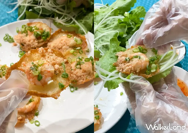 依照越南道地的吃法,大家可以先取一片生菜夾入木瓜絲,捲入蝦餅後,沾點魚露醬一口吃下,又酥又香的滋味,還能吃到蝦子的Q彈,讓人不禁一口接一口,停不下來呢。而餐點份量部分,如果大家想再多吃其他夜市小吃,份量會建議兩個人一起點一份,才不會一下子就被餵飽了。