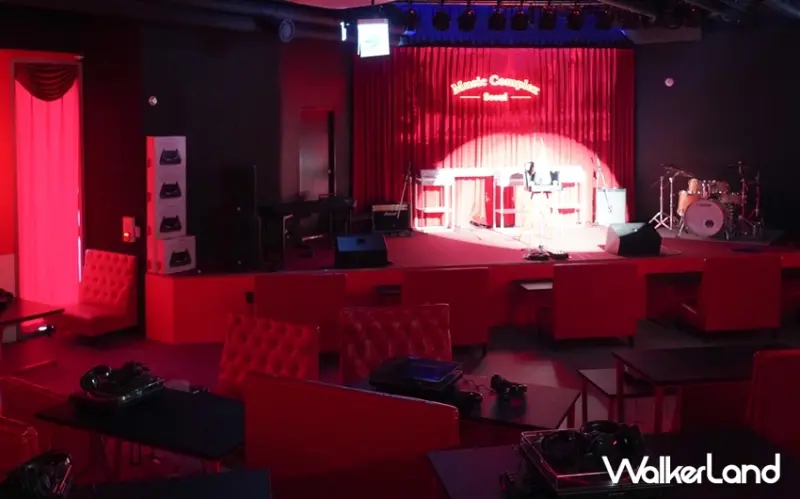 「Music Complex Seoul釜山店」空間以紅色系為主,燈光灰暗,氛圍如同置身懷舊的歐美秀場,而二樓空間確實表演舞台和觀眾席,對於現場音樂演出有興趣的旅人,不妨在出發前查閱「Music Complex Seoul釜山店」官網,看是否有自己喜歡的節目。