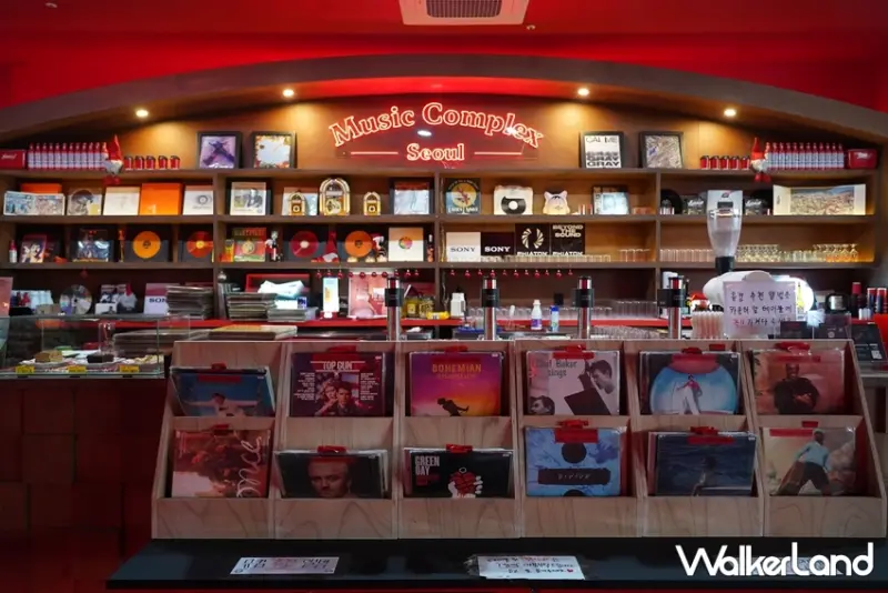 「Music Complex Seoul釜山店」位於釜山樂天outlet對面、釜山樂天世界入口前方,若不想進遊樂園玩,也能在此喝咖啡、聽黑膠唱片等候同行親友。一踏入「Music Complex Seoul釜山店」,旋即映入眼簾的是滿牆的黑膠唱片,數量總計超過二萬張,許多黑膠迷會在此拍攝打卡照。