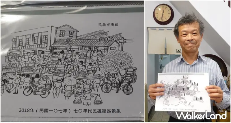 第二代吳老闆的好身手不僅落實在藥紙上、更展現於畫紙上,他受到兒子鼓舞,將腦海深處的民雄景象一筆一畫建構出來。五十年前的民雄街景與人文風采重現於一張張畫紙上,畫功精湛細膩,人物在他的刻劃下活靈活現、彷彿真能聽見市場小販中氣十足地吆喝著。