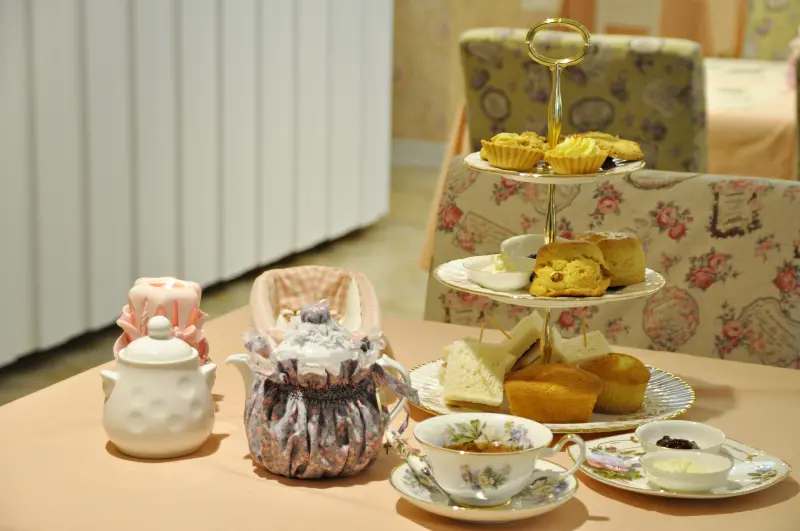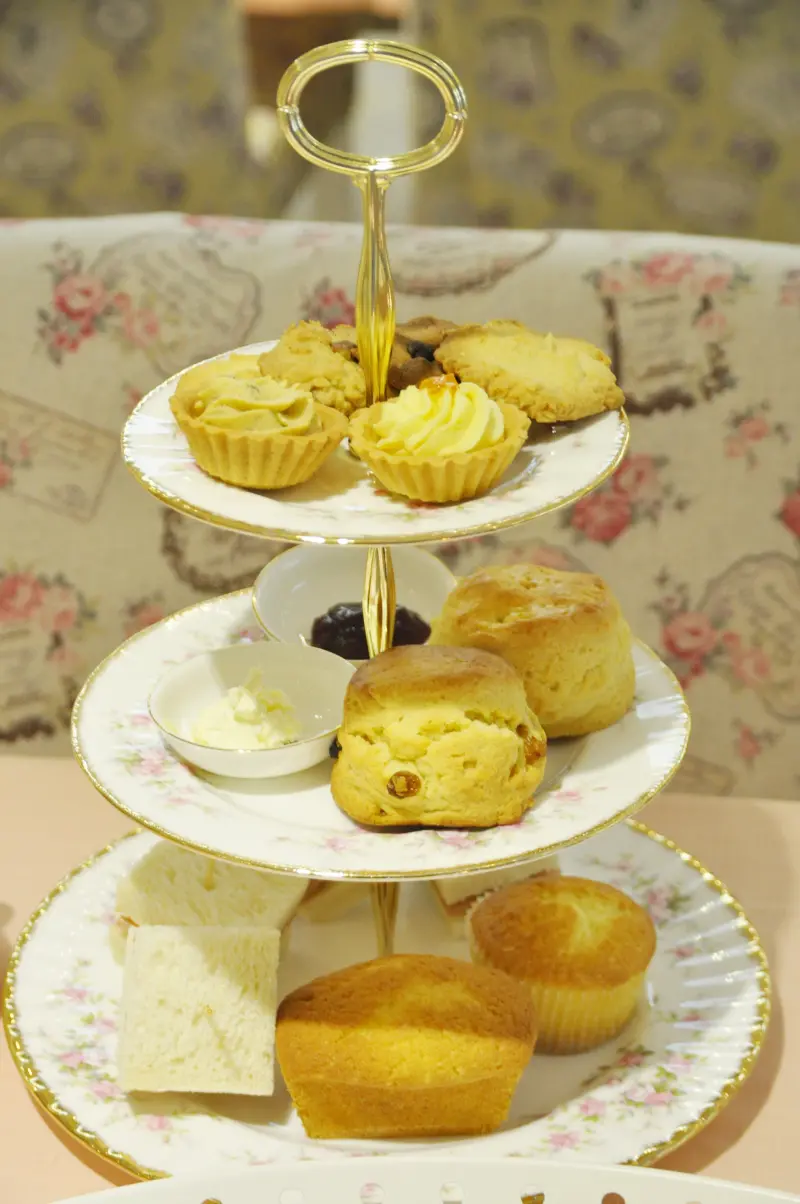 除了喝茶,三層架的正統英式午茶點搭配當然是不能少的!通常英式三層架下午茶點,會有三明治、英國傳統點心「司康」(Scone),小蛋糕、水果塔等主要點心,當然午茶盛行後,也越來越多人依照自己的喜好搭配,所以也常看見牛角麵包、魚子醬...等小點。