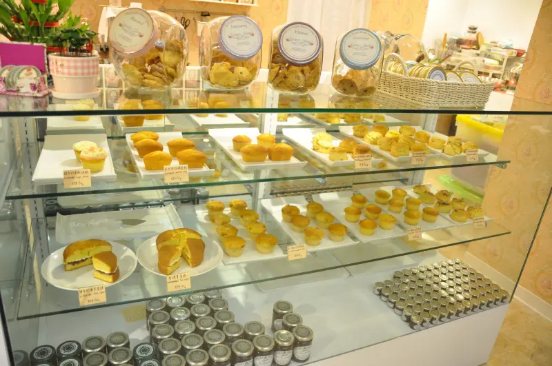 店內的蛋糕的製作與用材相當講究,雖然沒有繽紛或裝飾,大多都是烘培的金黃,但都講求使用天然尚好的材料,經理略為困擾的和小編透漏,台灣的好食材真的得花一番功夫才能覓得阿!從麵粉、奶油到製作需要的蔬果類、薰衣草等,有些甚至需特別從國外進口,店內有幾樣產品仍然遲遲無法開賣,是因為還沒找到適合的食材!經理對於食材的堅持相當嚴格,連製作磅蛋糕的柳橙都嚴格篩選,仔細的和小編分享了在台灣找到的進口香吉士橙口感偏酸,但為了忠於英國原味也無法用柳丁去替代!找到的香吉士需在水裡浸泡2~3次,僅取用薄薄的果皮以及果肉,才能做出香甜可口的果醬。