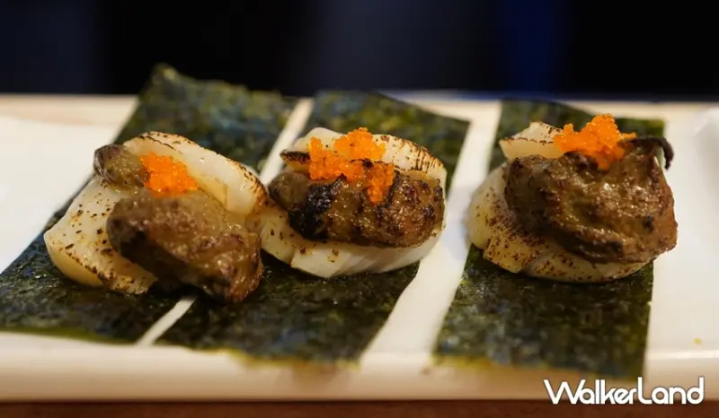 「蟹膏干貝堡」外型乍看如同迷你漢堡,將微微炙燒過的干貝劃開後、填入蟹膏,再加上魚卵妝點,可以感受到鮮美又濃郁的蟹膏滋味,開動前別忘了先用海苔將干貝包裹起來;要特別注意的是,「擇食居酒屋」每日都座無虛席,建議提早打電話預約。