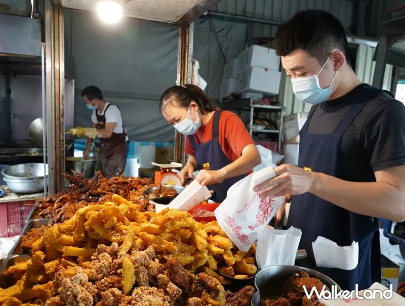 如果沒有在地人帶路,自己來新化旅遊很難發現「葉麥克炸雞」,因為攤位藏在一間鐵皮屋之中。每天營業時間一到,就會瞬間湧入排隊人潮,不少熟客等一個小時也甘願。各式各樣的炸物在攤位上堆疊如一座炸物山脈,畫面十分療癒誘人。