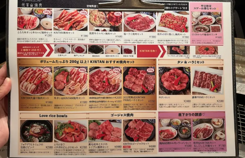 看看菜單,午間套餐的價格從1,380日圓到2,680日圓不等,相當親民,無論是牛小排、牛五花、牛內臟還是招牌30天熟成牛舌,都能在這個價格範圍內找到,如果預算充裕,還能品嚐到各種特殊部位的創意料理。