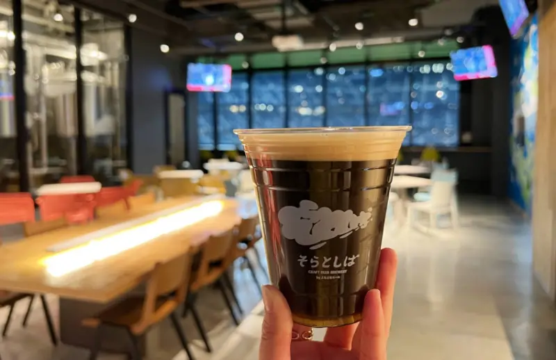 走了大概15分鐘,才從內野一壘抵達二外野後方屏幕的精釀啤酒廠與啤酒餐廳「そらとしば by よなよなエール 精釀啤酒餐廳」,點一杯原創精釀啤酒,再搭配隔壁的章魚燒,隨性坐在開放式人工草皮上觀賽用餐。