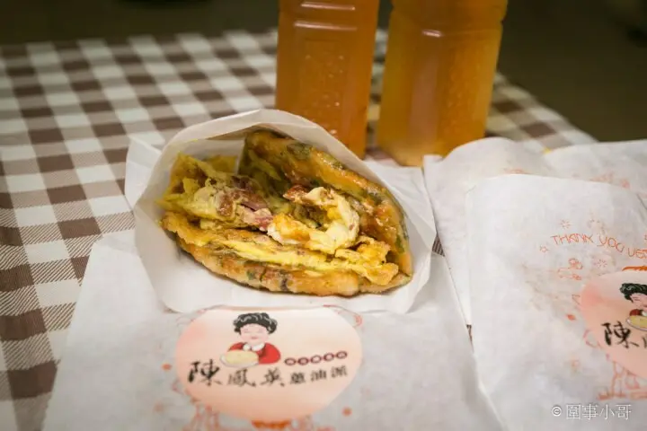 蔥油派煎得差不多的時候大姐就會先打一顆蛋在容器裡,然後加入份量很多的鴨賞或是香噴噴的蝦米!而且這個鴨賞是大姐自己做的呢!熱騰騰的鴨賞蔥油派只要撒上些許胡椒粉就非常好吃囉!<全文介紹>