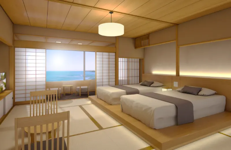 今井莊共有53間客房,這次翻新後的客房,全部都能欣賞到伊豆的壯闊海景。每天早上醒來,映入眼簾的就是一望無際的海平面!不只如此,設計師特別將客房打造成明亮舒適的和風現代風格,除了傳統的和室之外,還新增了設有床鋪的選擇,不管你喜歡哪一種,都能找到適合自己的完美客房。![]()