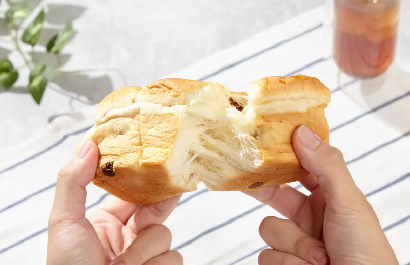 這樣簡單卻細節滿滿的享受,直接收服所有麵包控的心!可以成就如此美味體驗,都要歸功於原料使用日本優質小麥粉及加入的瑞穗鮮乳,讓奶香與麵包體的香氣襯托出來!撕開麵包後吃進嘴裡可以感受到甜美醇厚的奶香味,搭配粒粒分明的香甜葡萄交織在一起,只有超級滿足幸福感爆表可以形容!