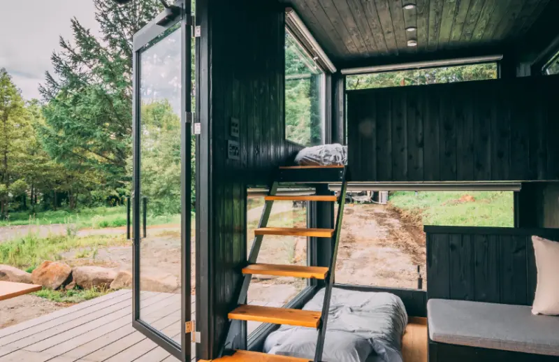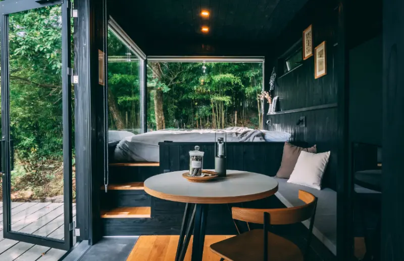 「THE STAGE」是一棟以黑色為主調的方形小屋,外觀採用時尚的工業風。踏入屋內,主臥室寬敞舒適,床鋪正對著落地窗,一覺醒來就能看到窗外的山景。從客廳延伸出去的木製露臺,更是欣賞日出日落的絕佳位置。屋內大量使用了日本產的杉木,營造出溫馨質樸的氛圍,處處展現了日式美學的精髓。![]()