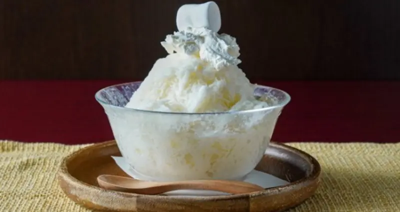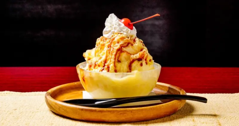 這款刨冰完美重現了日本老字號咖啡廳的經典甜點風味。濃郁的香草布丁味與焦糖香在舌尖綻放,彷彿回到了昭和時代的咖啡廳。刨冰上淋上大量焦糖醬,再搭配鮮奶油及裝飾用的櫻桃,絕對能滿足你的復古味蕾!