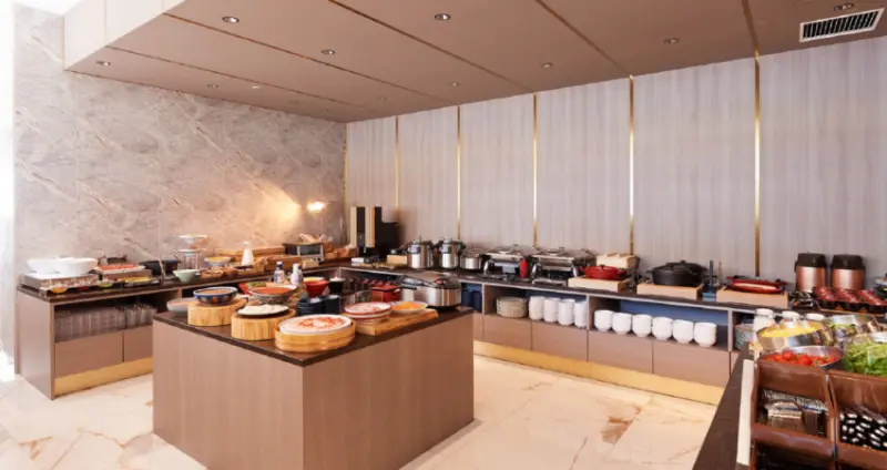 餐廳也提供自助餐式的早餐,包含西式料理和日式料理。菜色包含海鮮、沙拉、小菜、熟食、飯類、麵包類、湯品、穀物、甜點和飲料等。其中,海鮮區有新鮮鮭魚卵,這可是在其他飯店少有。早餐時間為07:00〜10:00(09:30最後入場)。