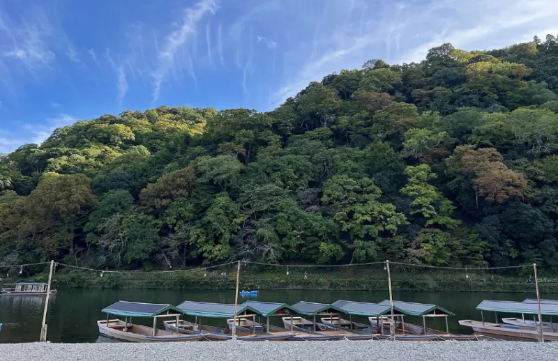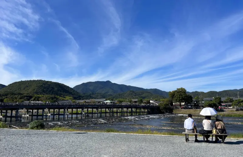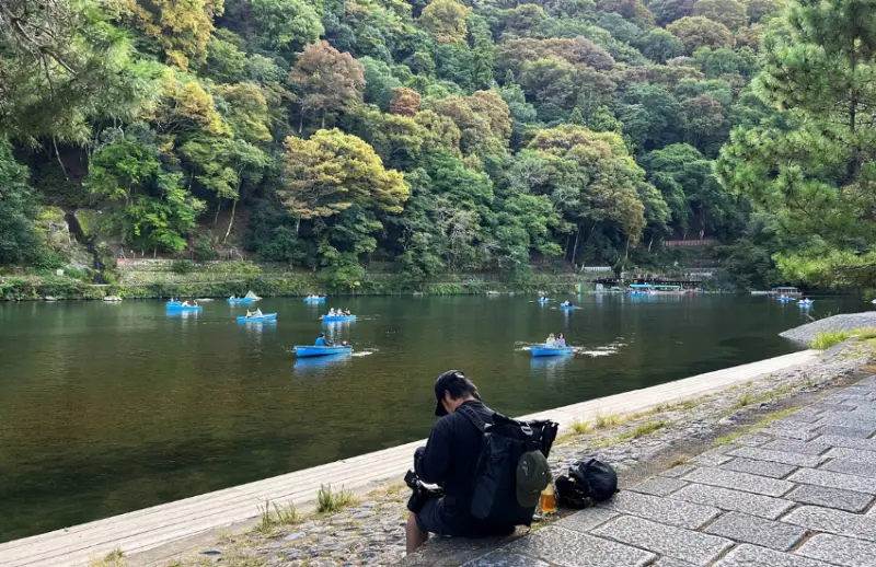 嵐山的空氣之中,總是瀰漫來自保津川峽谷的清涼氣息、桂川的水流聲在耳邊環繞,沿著溪畔的平緩散步道,能看到有人在喝咖啡、逗鴨攝影、划船戲水,甚至在寫生,即便酷暑難耐,嵐山依舊保持著一份清爽,讓人感受到與大自然的緊密聯繫。