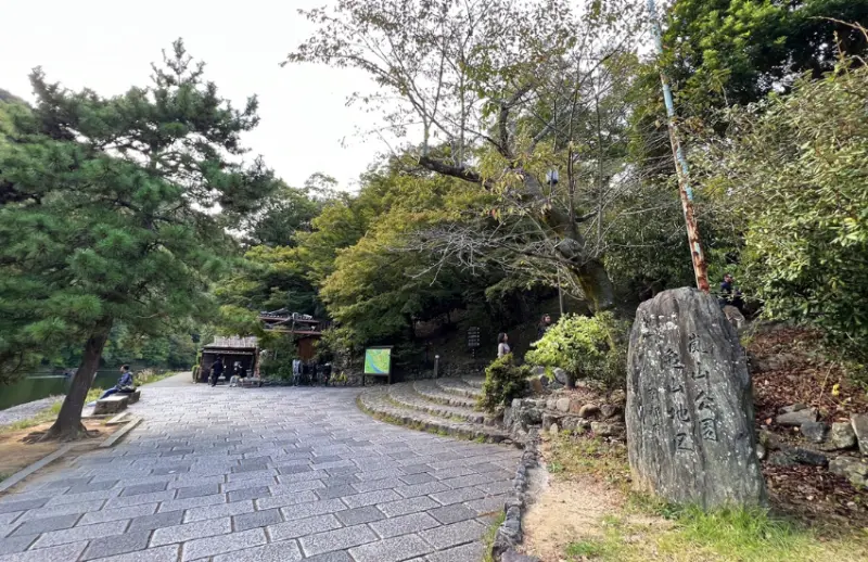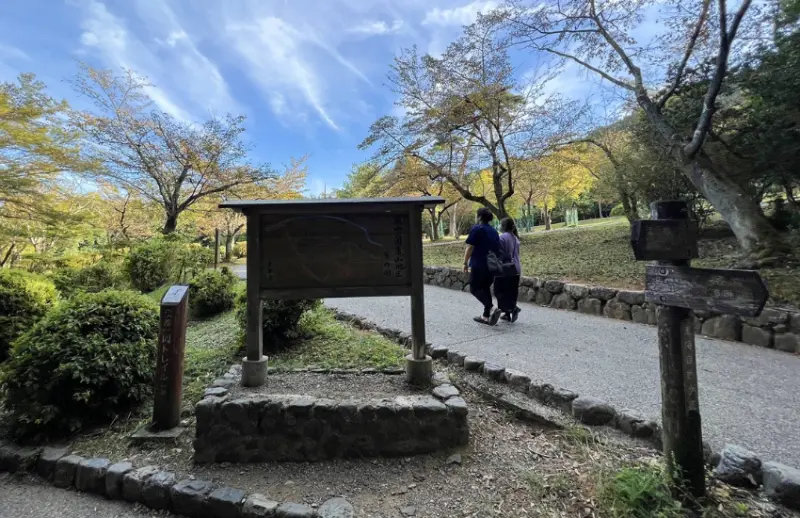 渡月橋的另一側,順著清澈的桂川溪畔悠然前行,直到看到古樸的日式家庭料理餐廳-龜山家,你便能發現標誌著「嵐山公園龜山地區」的石碑。![]()