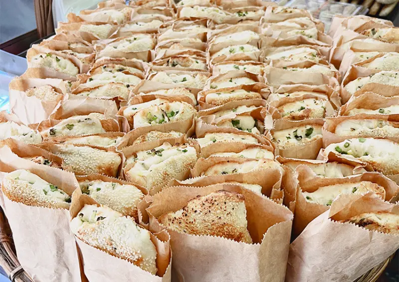 「阿國碳烤燒餅店」以五款經典口味的炭烤燒餅馳名,銅板價更是吸引人。首先是「三角餅」,其外皮酥脆、內餡鮮香,每一口都充滿了碳火烘烤的獨特風味,這款餅更是店內的明星產品,常常一早便售罄。如果不能到現場,店家還提供宅配服務,方便外地的朋友品嚐到這份古早味的美食。