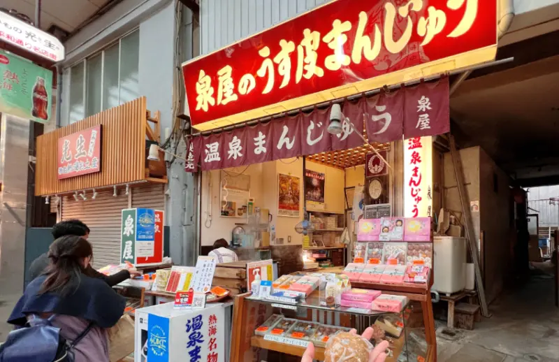一走出JR熱海車站,站前廣場擠滿了一排排接送旅客的溫泉旅館巴士,平和通商店街人聲鼎沸,上了年紀的攤販熱情地招呼著,販賣各種寫著「熱海名物」字樣的海鮮串烤、伴手禮和著名的溫泉饅頭,許多人都直接坐在路邊,愉快地吃起來。![]()