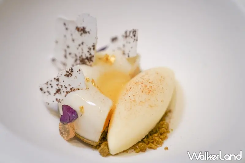 前甜點「無花果/柚子/香瓜/馬斯卡彭慕斯」,使用帶有堅果香氣的無花果葉製成的冰淇淋和脆片,佐以茴香醃漬香瓜和柚子醬,口感清爽、尾韻細膩;主甜點「鳳梨/馬鞭草慕斯/野薑花冰淇淋」以新鮮水果融合草本香氣,馬鞭草慕斯包覆著鳳梨果醬,搭配薑汁軟糖以及野薑花冰淇淋,並淋上鳳梨迷迭香果醬汁,為這趟如蝴蝶翩翩飛舞般、繽紛絢麗的法式饗宴完美收尾。