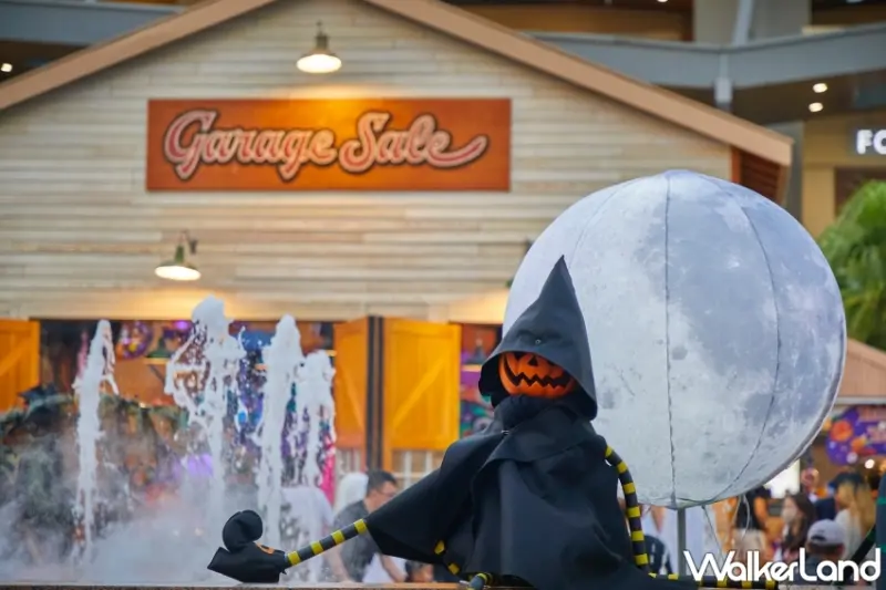 巨型月亮景觀:在一期噴水池區,佈置了巨大月亮和南瓜頭女巫,搭配微暗的燈光效果,營造出陰森詭異的萬聖節氛圍,是拍照打卡的絕佳背景。
