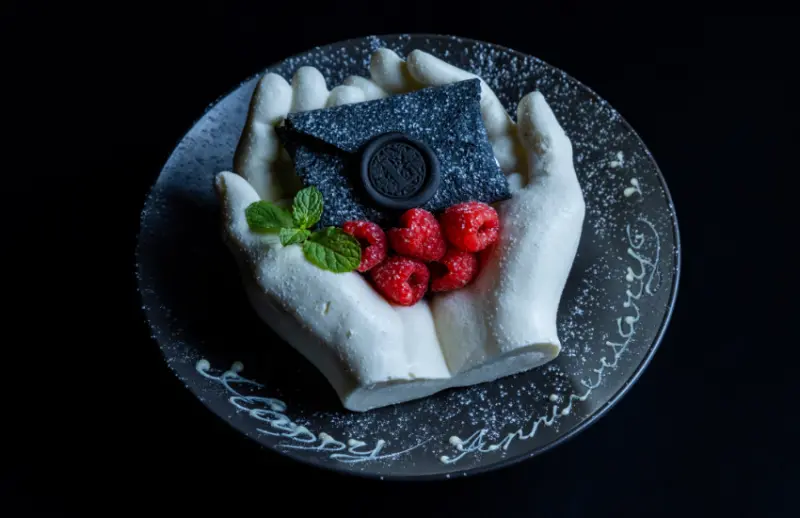 接下來是週年紀念蛋糕「Gift」。這款蛋糕的設計富有創意,一隻手掌捧著一封邀請函。手掌部分是口感細膩的乳酪慕斯,酸甜適中;而信件則是用竹炭製作的可麗餅,充滿神秘感。這個設計不僅呼應了萬聖節的氛圍,更寓意著傳遞心意……還是更像驚嚇呢哈哈哈。![]()