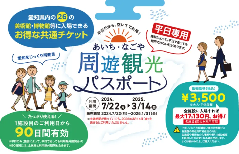 只要3500日圓,你就可以在90天內暢遊26個熱門景點!這張周遊券CP值超高。如果你把所有26個景點都玩遍,最多可以省下17,130日圓!這簡直就是為精打細算的小資旅行者量身打造的。另外,要注意的是,這份周遊券只能在平日使用,假日不能使用喔,但限定平日的話,剛好也可以避開周末的人潮。購買方式也很方便,你可以選擇直接在網站上線上購買電子票券,或是到當地的觀光案內所購買紙本票券。涵蓋的景點遍布名古屋市區、尾張地區和三河地區。在名古屋市內,你可以參觀愛知縣美術館欣賞藝術品,或是在名古屋港水族館與海洋生物親密接觸。喜歡科技的話,豐田產業技術紀念館絕對不容錯過。如果想要探索名古屋周邊,尾張地區的清洲城和明治村博物館都是絕佳選擇,讓你穿越時空,體驗日本的歷史風情。