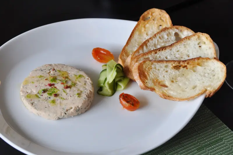 主廚顏選馬士卡邦起司,拌入花蓮在地龍眼木煙燻後的鮮魚肉等調製而成的抹醬,搭配自製香酥麵包片。
