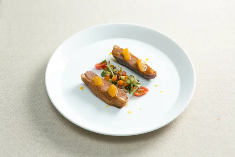 飼養於秀姑巒溪的櫻花鴨,當地因水質良好,使其在天然環境中生長出肥瘦均勻、皮薄肉豐的優良肉質;主廚以鐵板高溫香煎,搭配花蓮鳳林鎮的皮薄香甜、汁液豐富的茂谷柑,兩者於味蕾中層疊出優雅氛圍、香氣縈繞不絕。