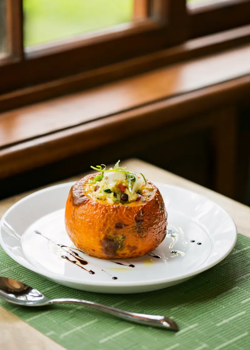 選以外觀飽滿鮮豔,口感鬆軟綿密,果實多汁的整顆東昇南瓜,放入吸收花東縱谷陽光之精華的花蓮富里米、帕瑪森起士等在地食材低溫慢烤而成,口口皆嚐得到土地芬芳之美;