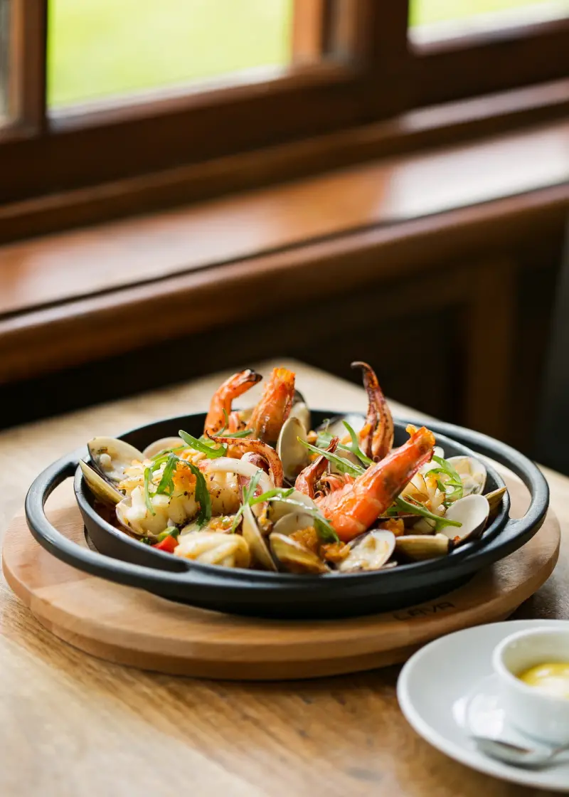 使用吸收花東縱谷陽光和山嵐甜淨水質的花蓮富里米,米粒大而飽滿,光澤佳且口感軟Q,咬勁與甜度皆為首選;與每日海港新鮮直送海鮮與西班牙臘腸、花東土雞、營養豐富的樹豆拌炒,剛出爐後的烤飯外脆內軟,一口享盡花蓮之美好