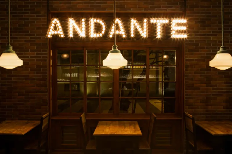 Andante為樂曲中「行板」之意,代表稍微緩慢的速度;Bistro則是指當地的小酒館或餐館,秉持重視食材履歷、選以獨家進口的健康肉品、花蓮當地生產的自然食材,如玉里鄉櫻花鴨、豐濱鄉石梯坪現釣鮮魚、石梯灣自然蝦、壽豐鄉東昇南瓜、富里鄉稻米、鳳林鎮的茂谷柑等,結合當地原住民常使用的光復鄉樹豆、馬告、刺蔥等食材,並搭配來自le bouquet繽紛麵包房的新鮮烘焙麵包,同時融合花蓮土地芬芳所製成的歐式甜點;主廚也精心挑選有機種植與自然動力種植法的葡萄酒款,邀您慢慢品味端上的道道美酒佳餚。