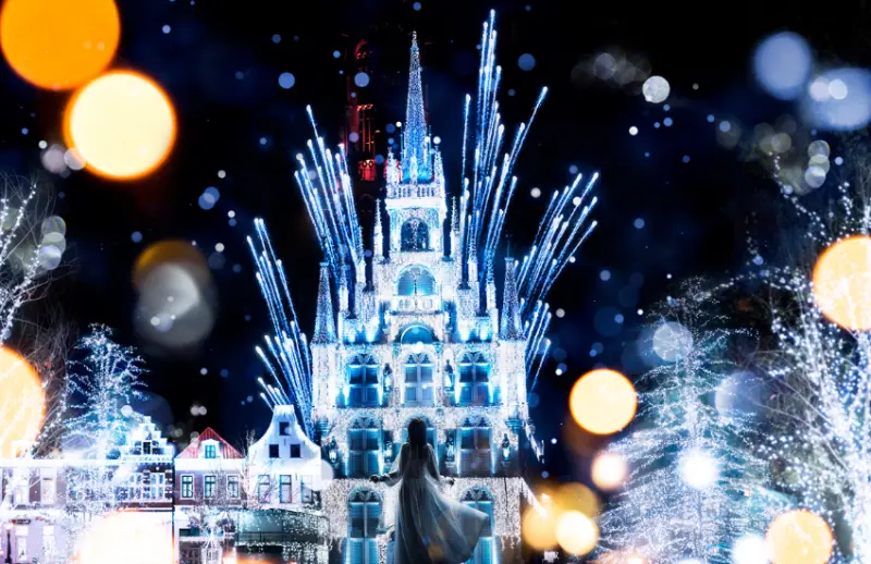 九州主題樂園豪斯登堡活動的重頭戲「奇幻雪夜秀」每晚都在園內阿姆斯特丹城中心的市政廳前演出。當日落餘暉褪去,教堂的鐘聲響起,歌手的優美歌聲將在廣場上迴盪。最令人驚豔的是,在表演的高潮時刻,整座歐洲街景會在一瞬間轉變成純白色的夢幻光影,配合著飄落的人造雪花,營造出北國浪漫的氛圍。![]()