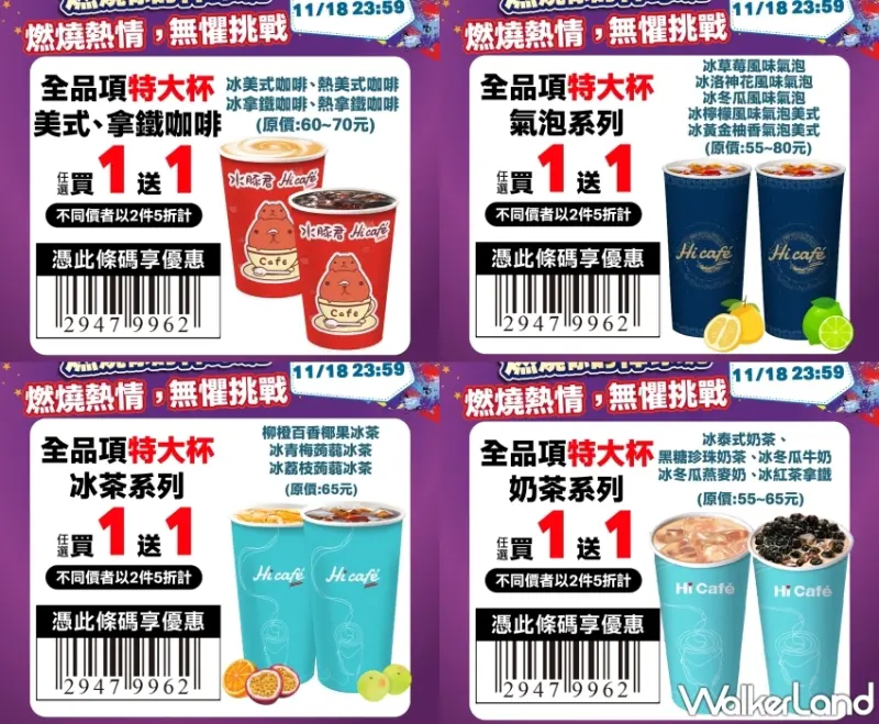 優惠:Hi café特大杯飲品全品項享限時買1送1,兩件不同價者以2件5折計算