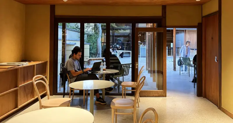 位於前往南禪寺的必經道路之前,京都藍瓶咖啡(Blue Bottle Coffee)選址一棟經過翻修的百年京町家,建築空間保留了傳統日式風格,分成前院、前廳、後院和後廳,這樣的建築風格對喜愛京都的人來說,無疑是一大亮點!藍瓶咖啡京都一號店(Blue Bottle Coffee Kyoto)兼容著現代簡約的敞亮設計和古老町家的原始木質氣息,筆電工作者各擁一處開放又靜謐的環境,放下咖啡的手,正在飛速敲打鍵盤,靈感與效率正被古老而新潮所環繞,自然而然地流動著。