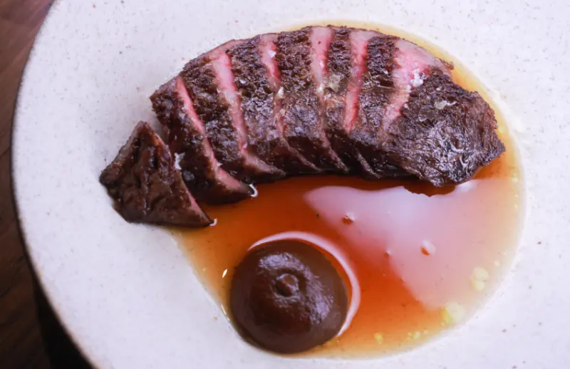 一樓是熱情的燒烤餐酒館「Ibushi」,整個氛圍讓人完全像是一秒來到東京的居酒屋,煙燻的串燒,秘製的烤牛排,主廚把牛排先熟成後烤,外酥內嫩,是這裡的招牌菜。![]()