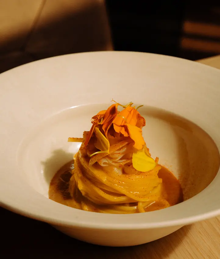 上到二樓,歐日混合的創新餐廳「Five」,主打的風格是創意的歐日混合風格菜,日籍主廚Hiroshi Manaka 親自桿的義大利麵,完全融入自創的手法,讓這手工義大利麵條,滑順有勁,加上特調的海鮮醬汁和配料,風靡不少饕客,菜單從前菜到主餐都是歐日混合風格菜的創意結合。![]()