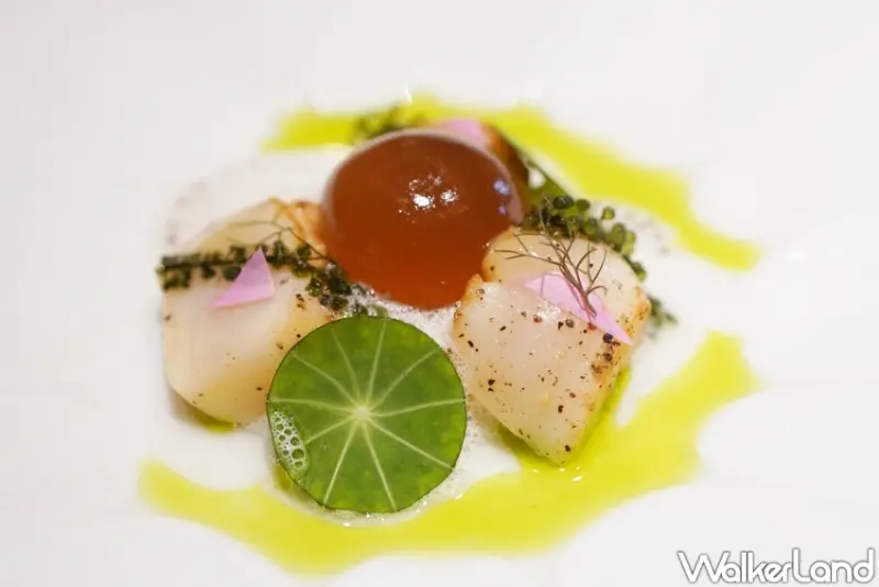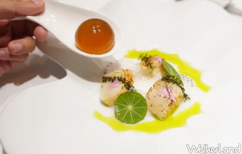 冷前菜「立冬潤養」選用北海道干貝、海葡萄和奇亞籽等食材,搭配以檸檬醃漬入味的冬瓜絲,並讓饕客親自將由冬瓜茶、澄清蕃茄汁以及香水蓮花調和製作得透亮晶球置入菜餚之中,接著淋上帶有港式風情的自製鹹檸檬泡沫、無花果葉油,彷彿一座翠綠盎然的池塘在盤中展現生命氣息,劃開晶球那瞬間亦象徵迎接冬天來臨。