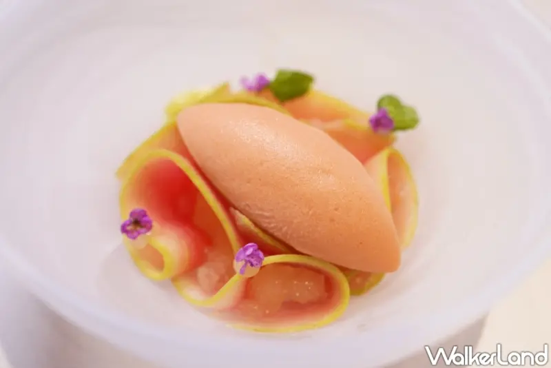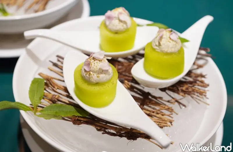 揭開序幕的迎賓飲品「秋露甘茗」,將經典的茉莉綠茶升級,將日本哈密瓜打成果汁後,再加入椰奶、茉莉花低溫烹煮,並以冰滴手法萃取其清澈的精華、添加茉莉綠茶調製而成,最後茉莉花泡泡置頂,猶如秋日晨露中、且散發著清新花香的初陽。![]()